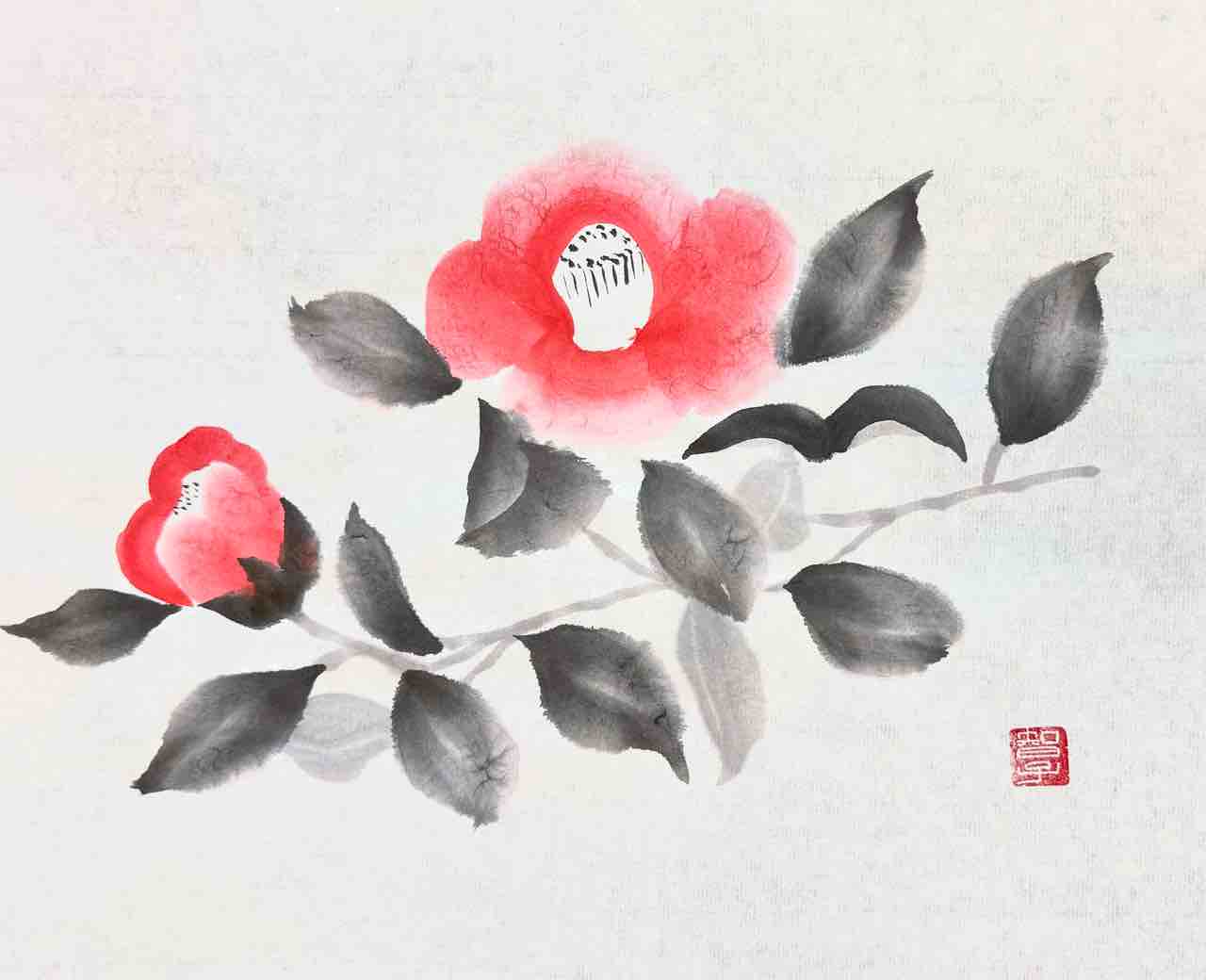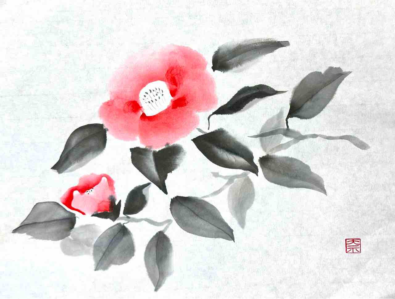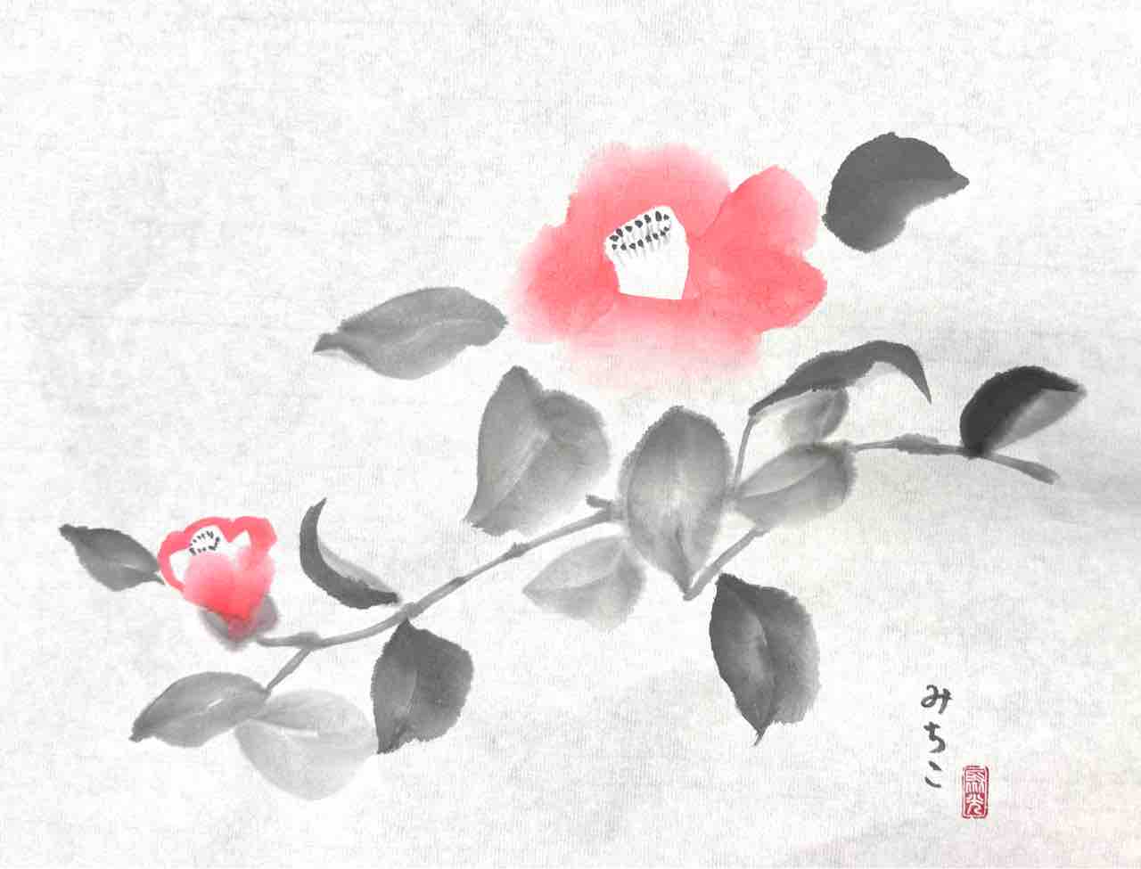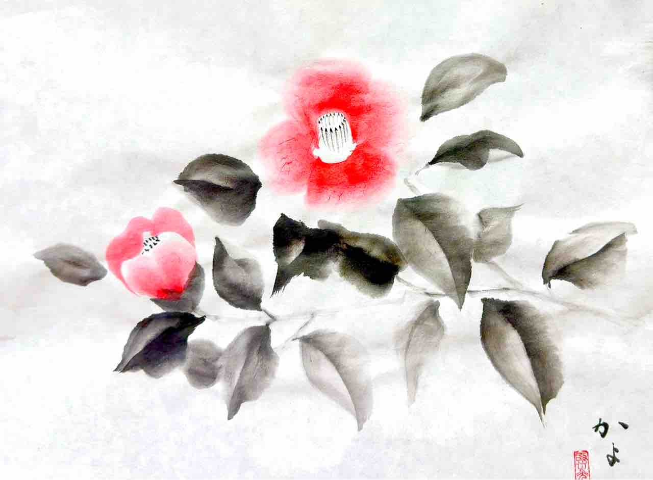 国際墨画会水曜英語対応クラス生徒さん作品。椿を描きました。紅の花びら一枚を、一筆でグラデーションを使いながら描いていきます。筆遣いに慣れるまで時間がかかりますが、皆さん美しい椿が描けました🌺