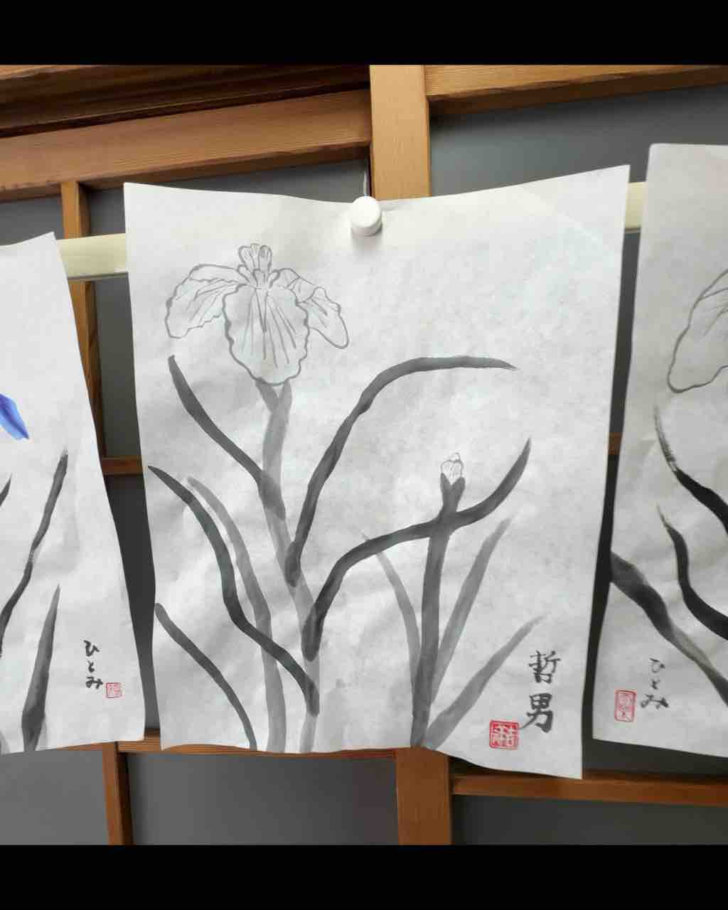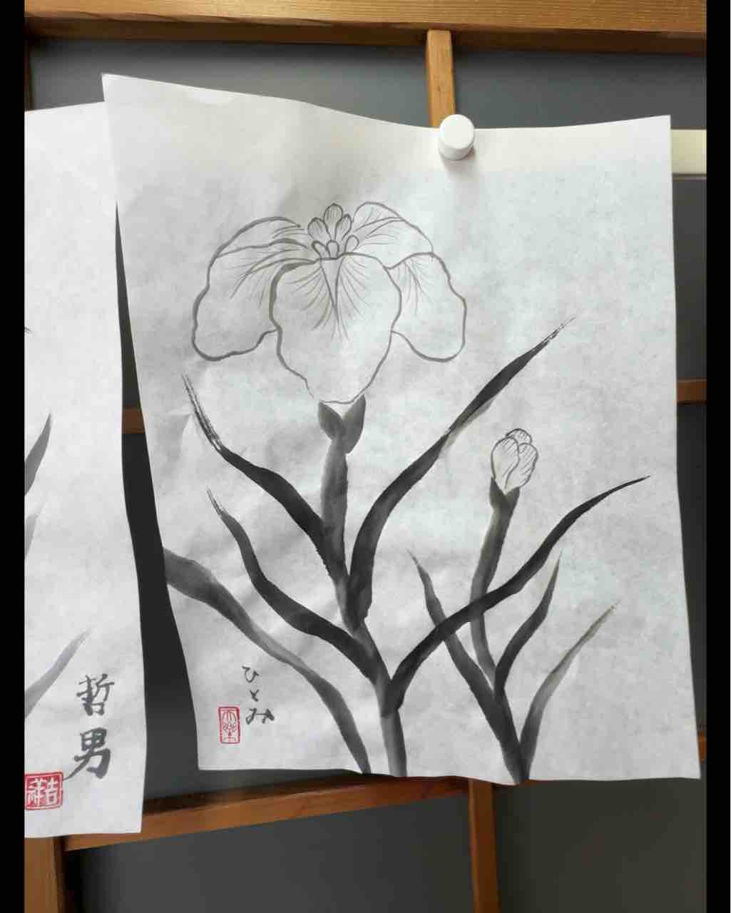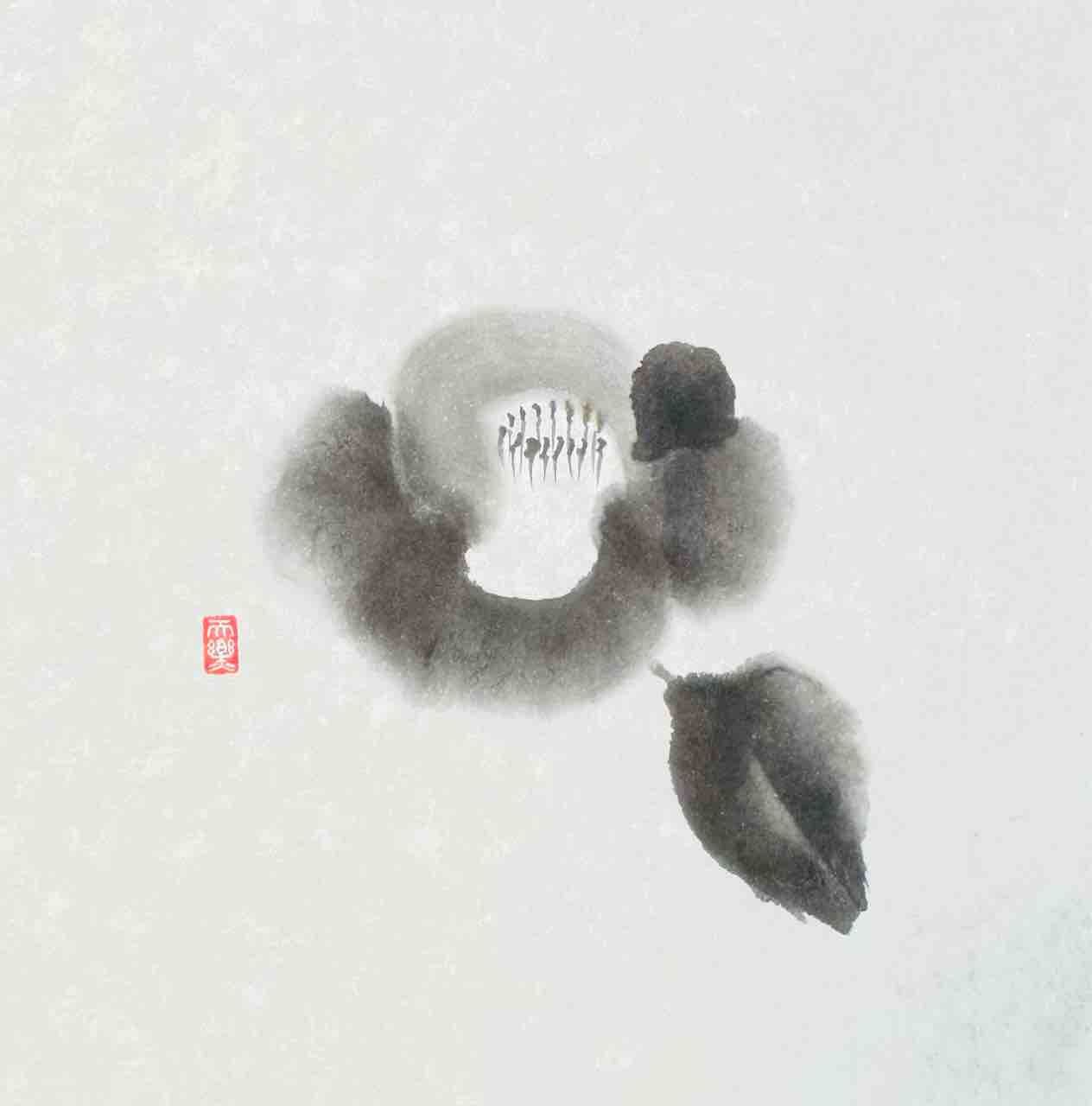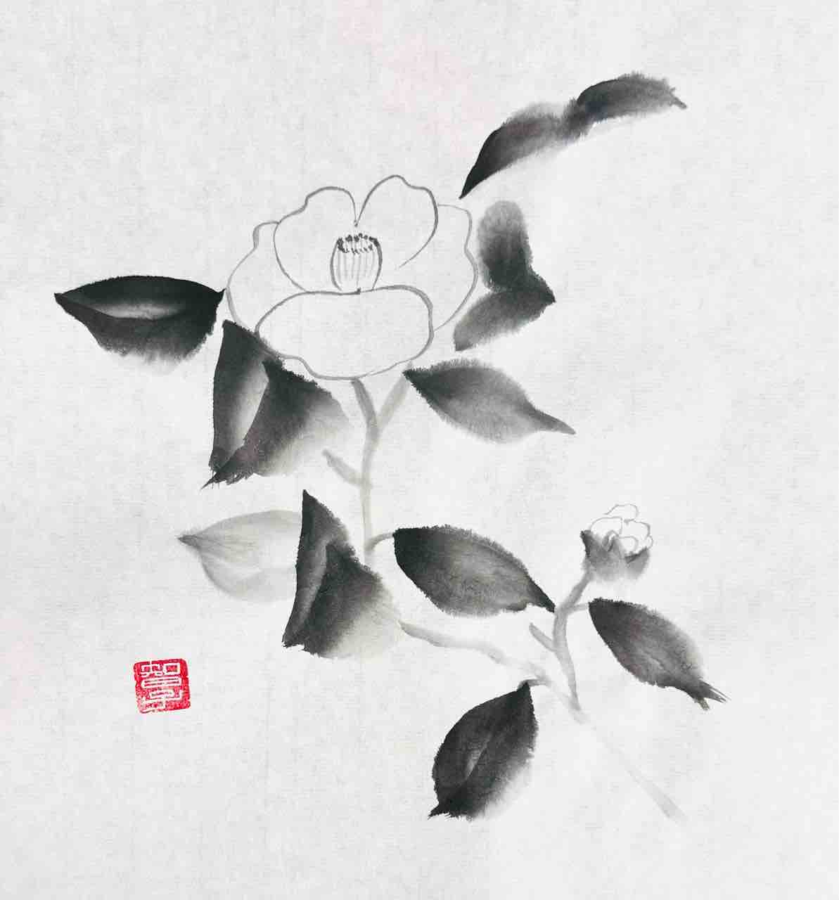 国際墨画会水曜英語対応クラス生徒さん作品。椿を描きました。紅の花びら一枚を、一筆でグラデーションを使いながら描いていきます。筆遣いに慣れるまで時間がかかりますが、皆さん美しい椿が描けました🌺