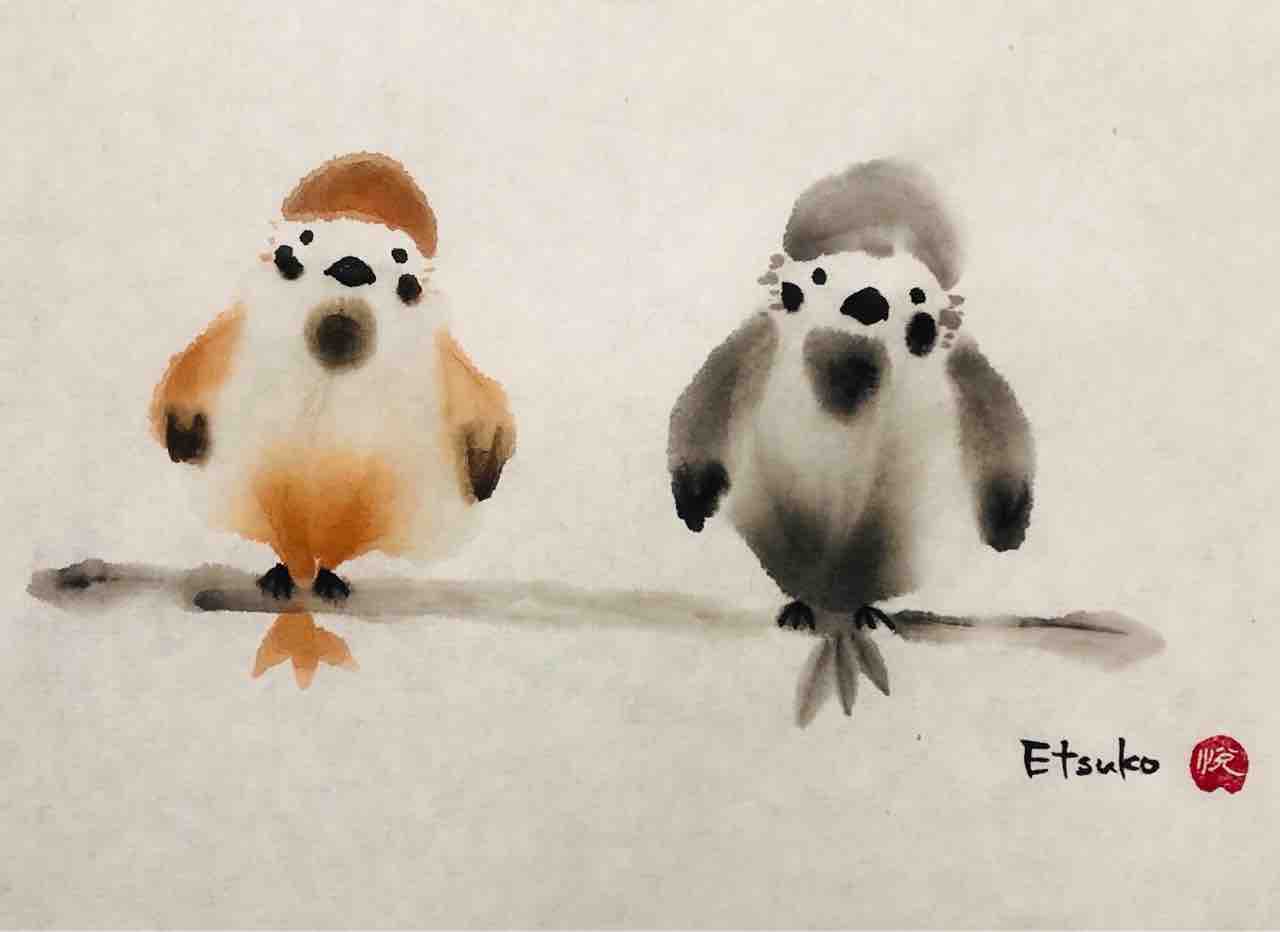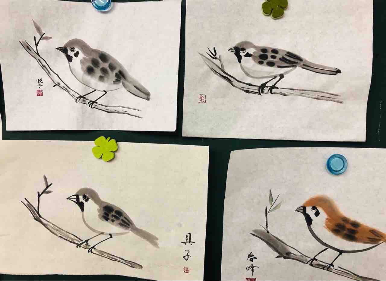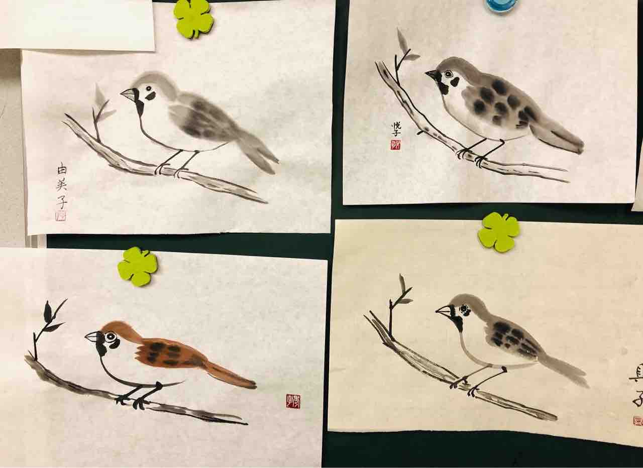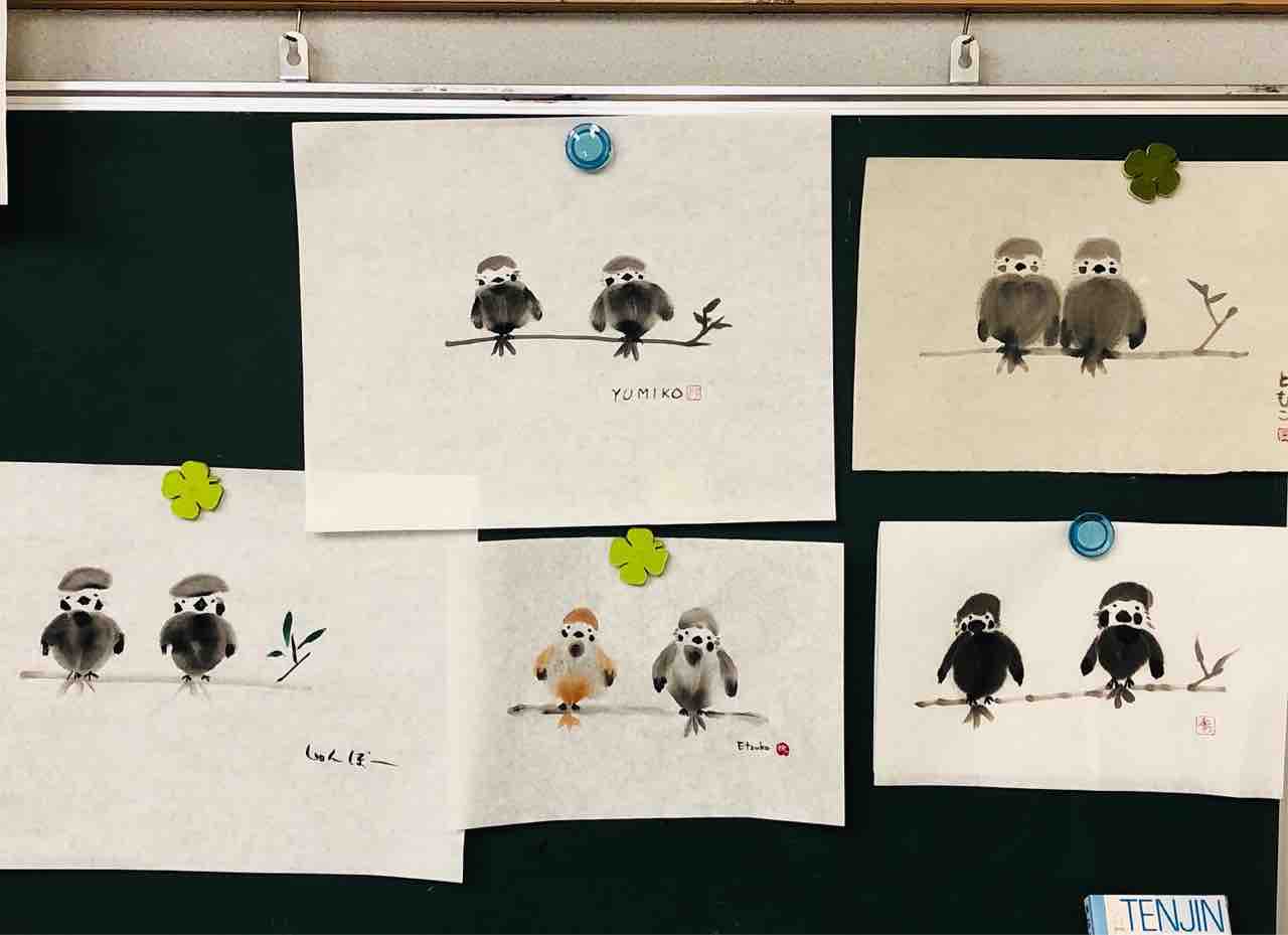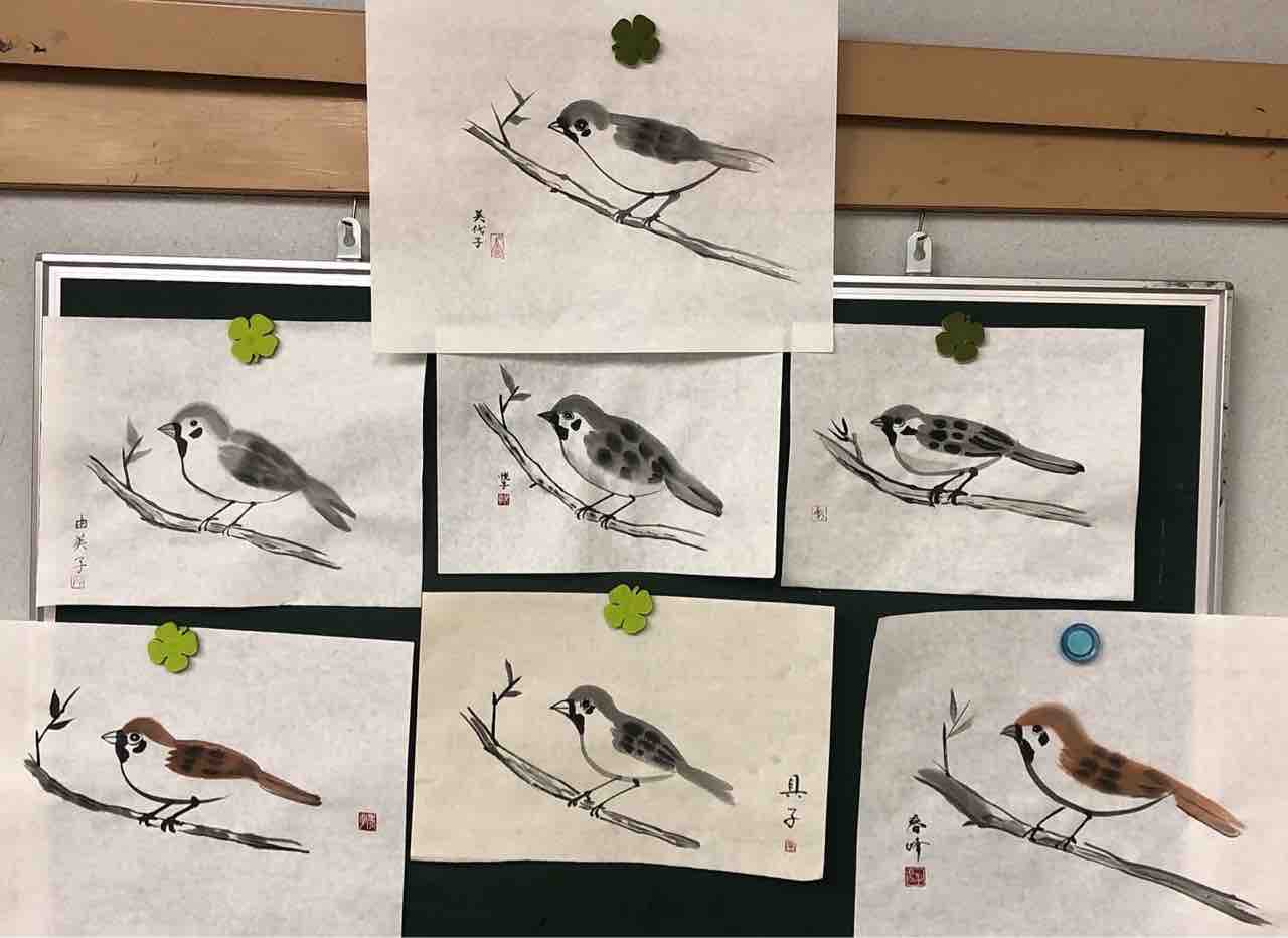 2022年04月22日 桜上水出張クラス 雀を描く 桜上水出張クラス生徒さん作品。「動物が描いてみたい!」というリクエストを生徒さんから頂き、みんなで雀を描きました。古典的な描き方と、抽象的な描き方、2種類を学びます。動物は、描く人それぞれで表情が違うので、とても楽しいモチーフです。皆さんそれぞれ豊かな表情の雀が描けました🥰Students works from Sakurajosui visiting class.
