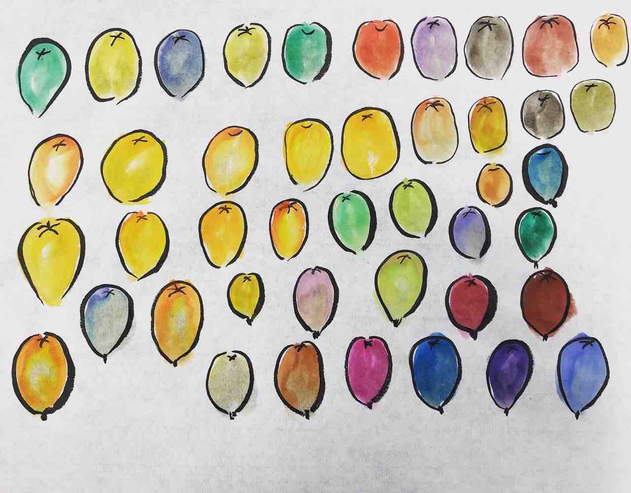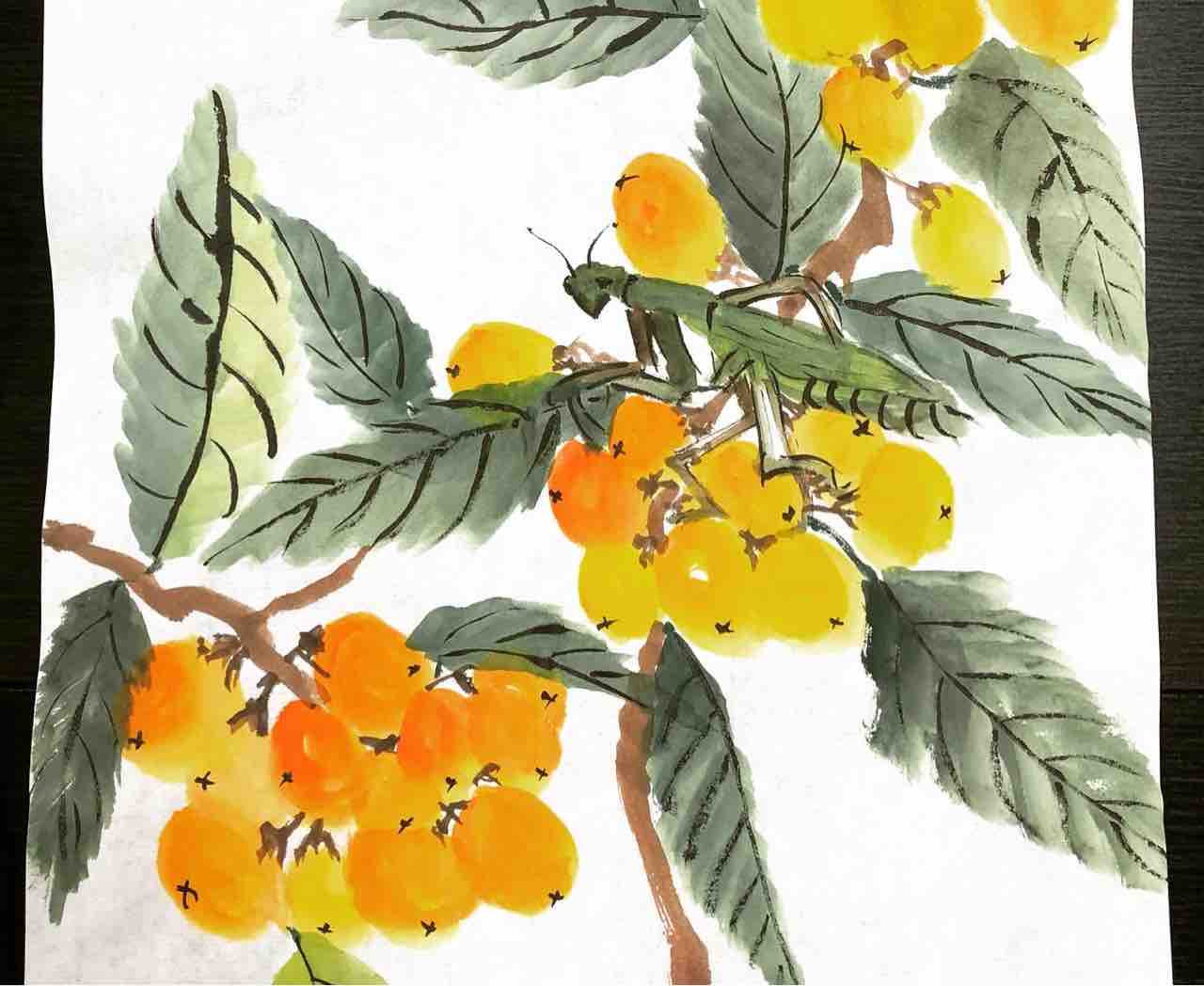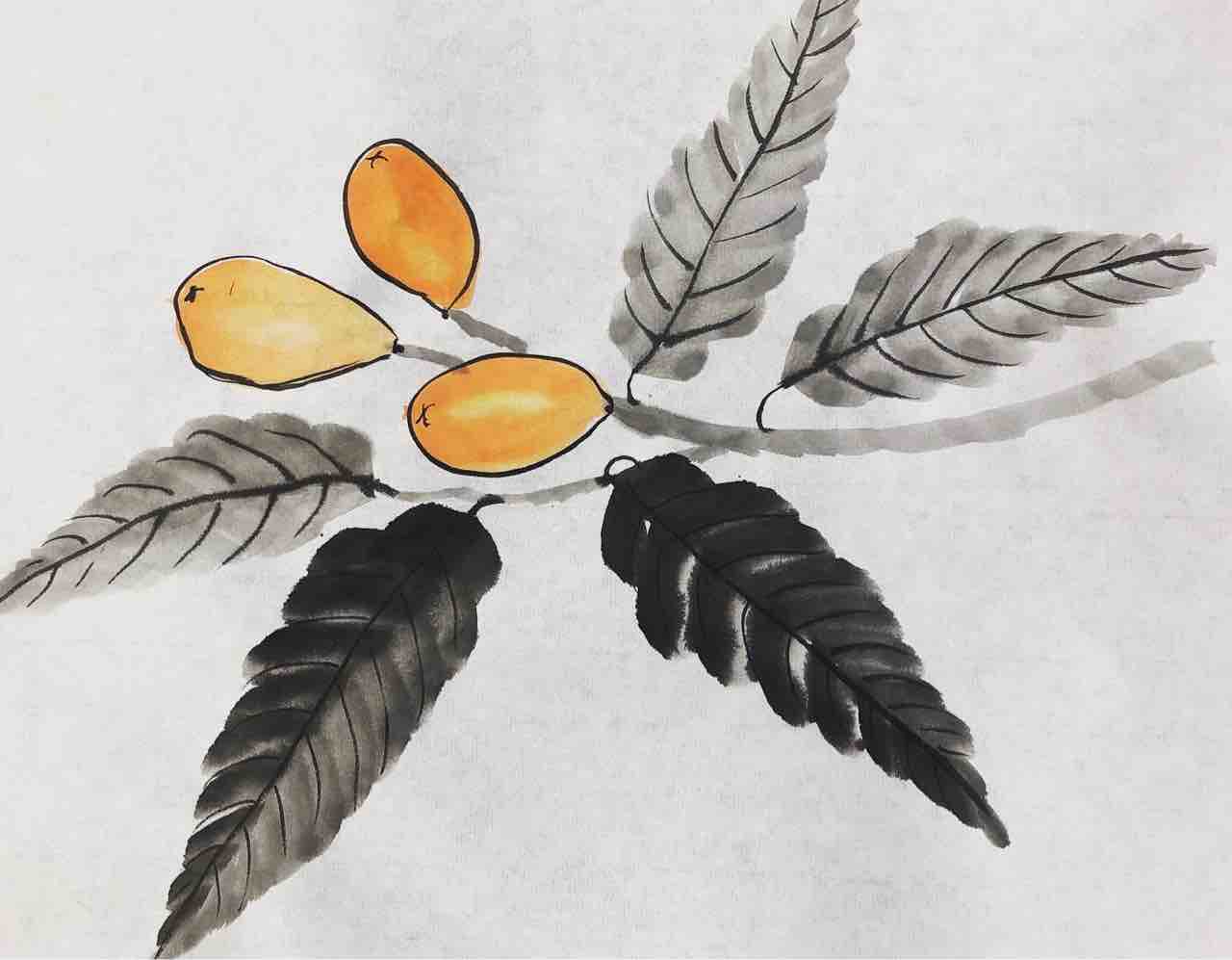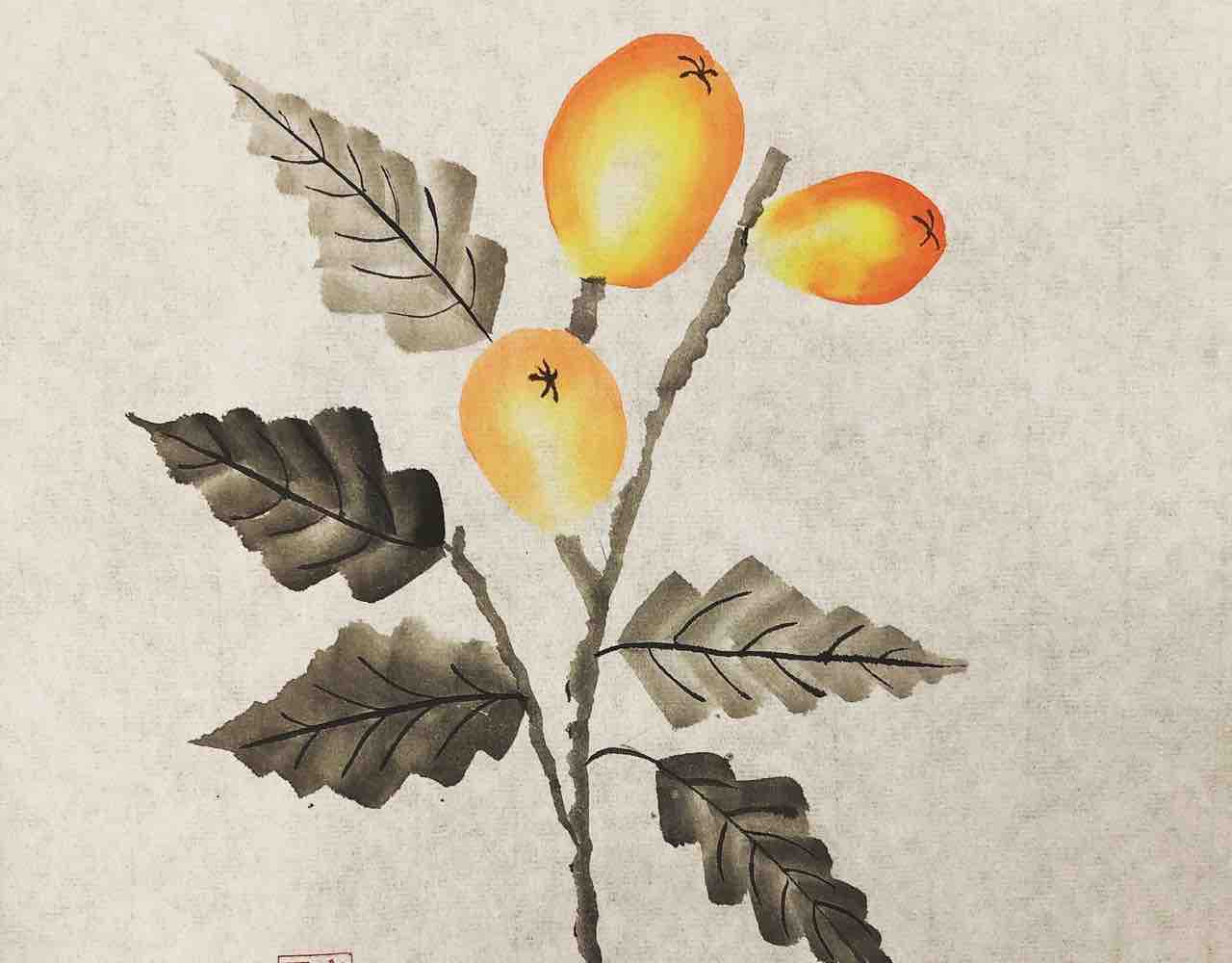 2022年02月11日 国際墨画会水曜夜間英語教室 枇杷を描く 国際墨画会水曜夜間英語教室生徒さん作品。課題は枇杷です。筆を倒して回転させながら、枇杷の形を一筆で描き、2色使って、自然なグラデーションを作ります。Students works from International Sumie Association English class.