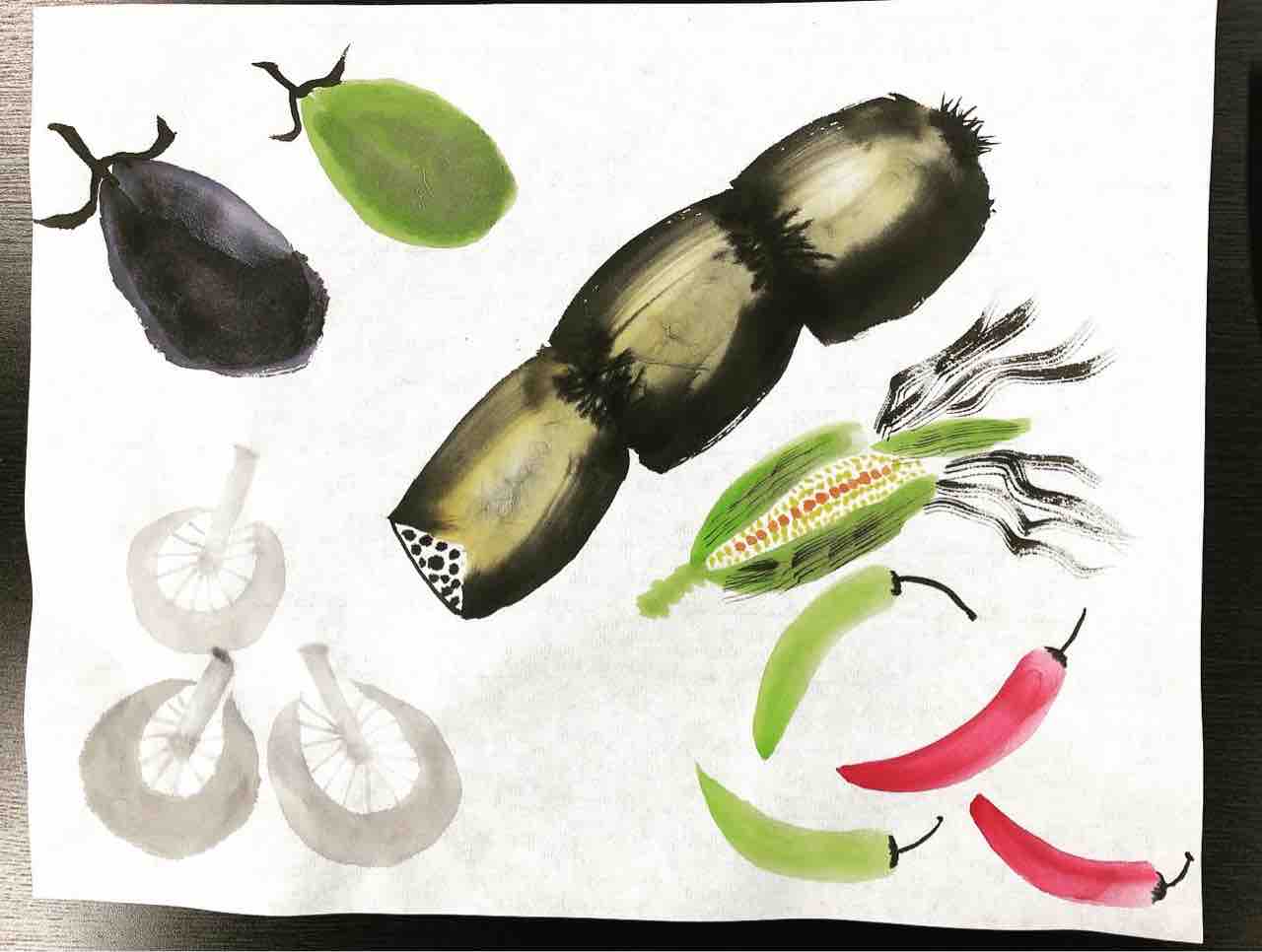 2022年02月11日 国際墨画会水曜英語クラス 野菜を描く 国際墨画会水曜英語クラス生徒さん作品。今月の課題は、野菜です。ナスやキュウリの描き方を学んだ後、自由にアレンジしてもらいました。1枚目はイタリア人生徒さんEさんの作品。絵本に出てくる挿絵のような可愛い作品に仕上がりました。2枚目は日本人生徒さんTさん作品。野菜を顔にアレンジしてくれました。3枚目はアメリカ人Rさん作品。前回の課題の枇杷をアレンジして描いてきてくれました。Students works from International Sumie Association English class.