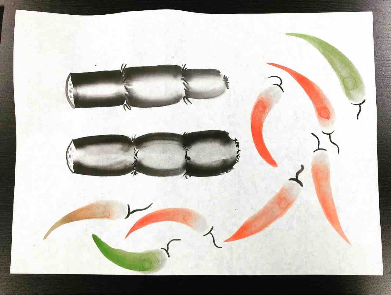 2022年03月15日 国際墨画会水曜夜間英語教室 野菜を描く 国際墨画会水曜夜間英語教室生徒さん作品。今月の課題は野菜です。レンコンを練習していたSさん、よく見ると右のレンコンの顔が顔なしに🤣Students works from International Sumie Association English class.