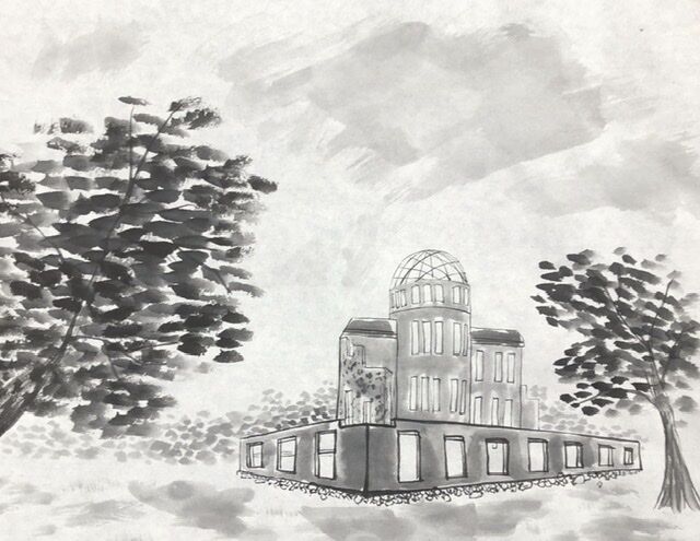 前半2時間のモチーフは、「原爆ドーム」。透視図法(パース)や、構図について簡単に学んだ後、1枚の同じ写真から各々下絵を作成し、下絵の上から墨で線描きしていきます。