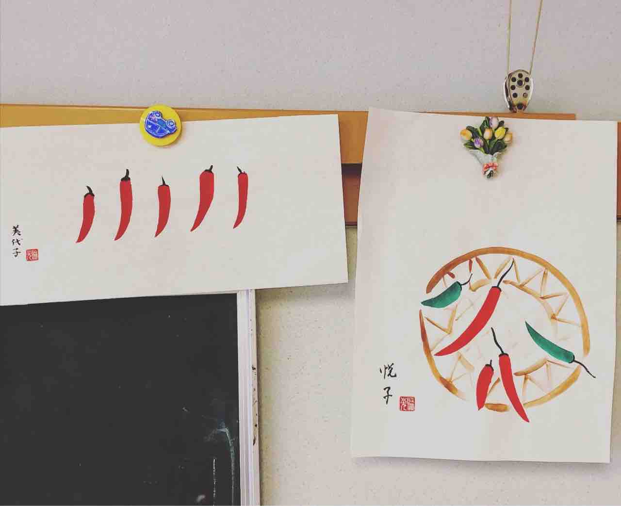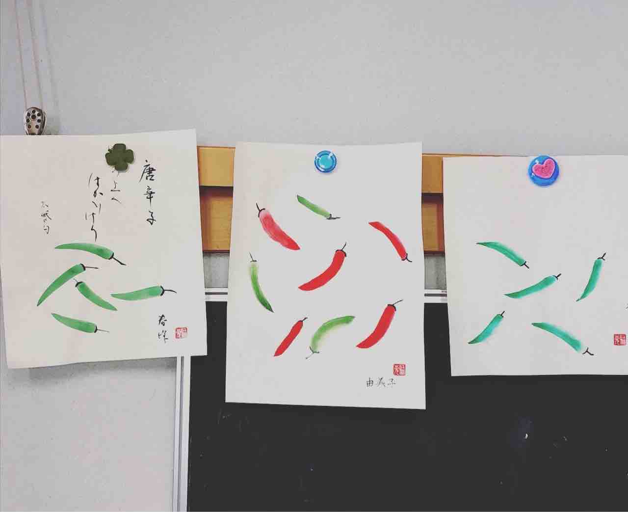 桜上水出張教室。 Visiting sumie class with 6 students, painting peppers and rabbits 🌶🐇 授業前半は鳥獣戯画の模写で線描きの練習。紙の下にお手本を敷いて線描きに慣れてもらった後、2枚目は手本を横に置いて模写してもらいました。同じうさぎでも、スマートなウサギ、可愛らしいウサギ、アンニュイな雰囲気のウサギ、みんな違った表情になるのが絵のいいところです😊🐇 授業後半は、唐辛子の基本的な描き方を練習した後、自由にアレンジしてもらいました。皆さんそれぞれ個性が出て、可愛くて楽しい作品がたくさんできました🌶