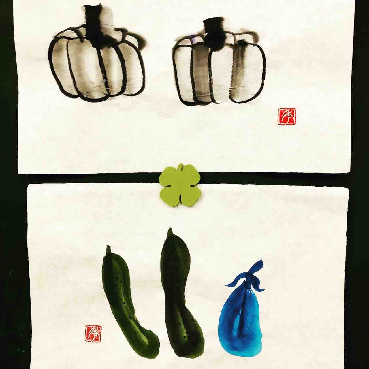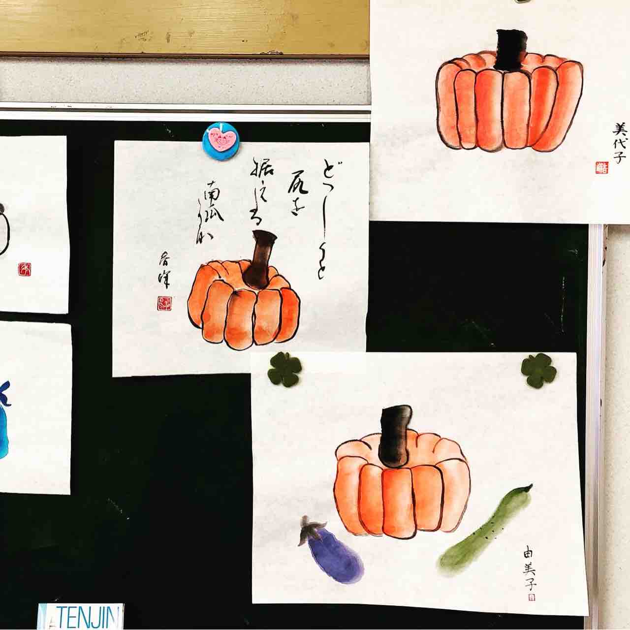 2021年10月28日 桜上水出張クラス 野菜を描く 桜上水出張クラス生徒さん作品。カボチャとナス、キュウリの描き方を学んで、それぞれアレンジしてもらいました。1枚目は仮名書道のS先生が、漱石の句を添えられた作品です。仮名書道と水墨画の組み合わせもいいですね😊その他も、ハロウィンカボチャにアレンジしたり、野菜を並べてみたり、生徒さんそれぞれが楽しくアレンジされて、素敵な作品ができました🥰Students works from Sakurajosui class. 「桜上水出張教室」カテゴリの最新記事