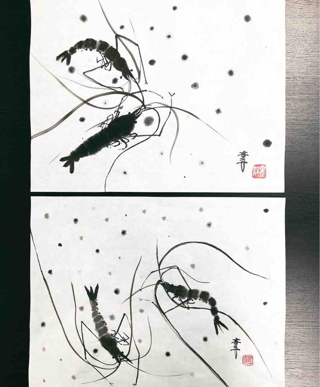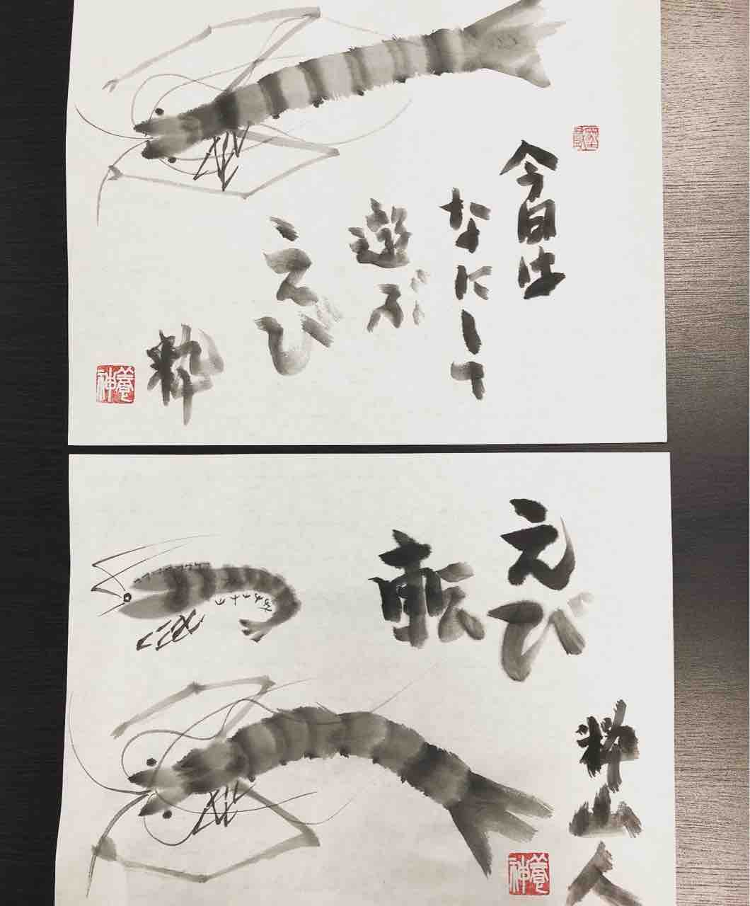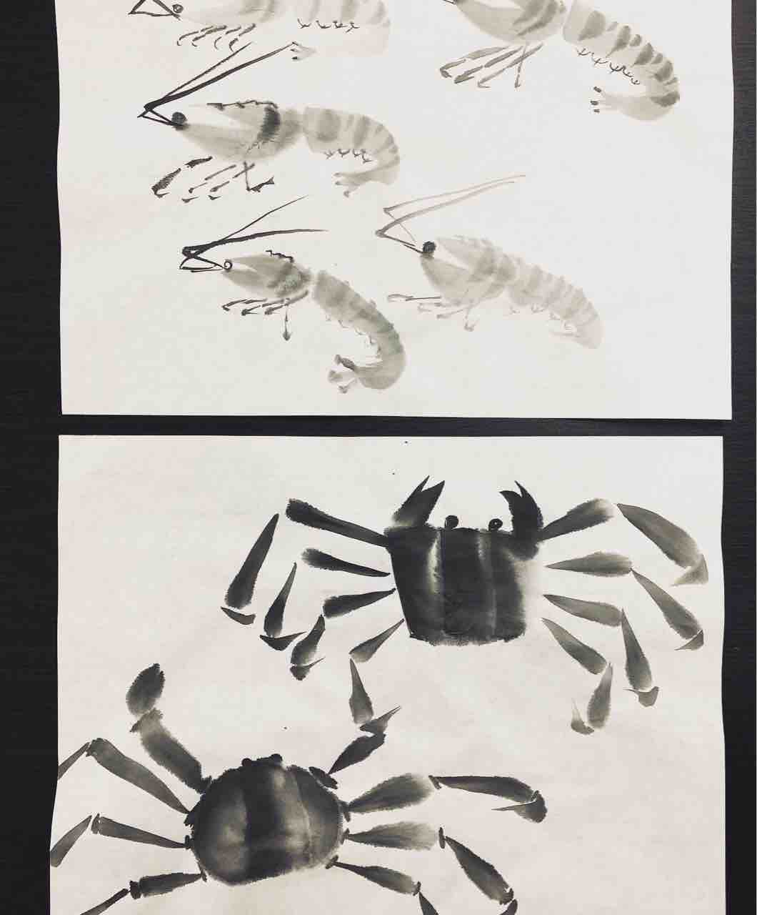 2022年06月27日 国際墨画会水曜教室 エビとカニを描く 国際墨画会水曜教室生徒さん作品。カニとイカを描きました🦑海老はシンプルな筆遣いですが、とても水墨画らしい作品を描くことができます。墨の自然な滲みを利用した水玉や、書などを添えて、それぞれアレンジして頂きました☺️Students works from International Sumie Association class. 「国際墨画会渋谷本部英語クラス」カテゴリの最新記事