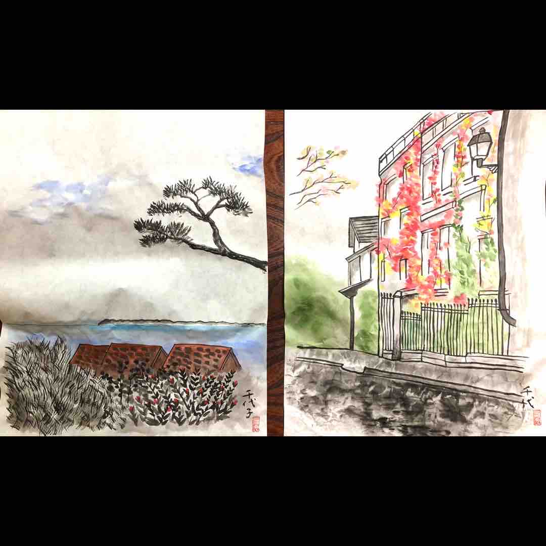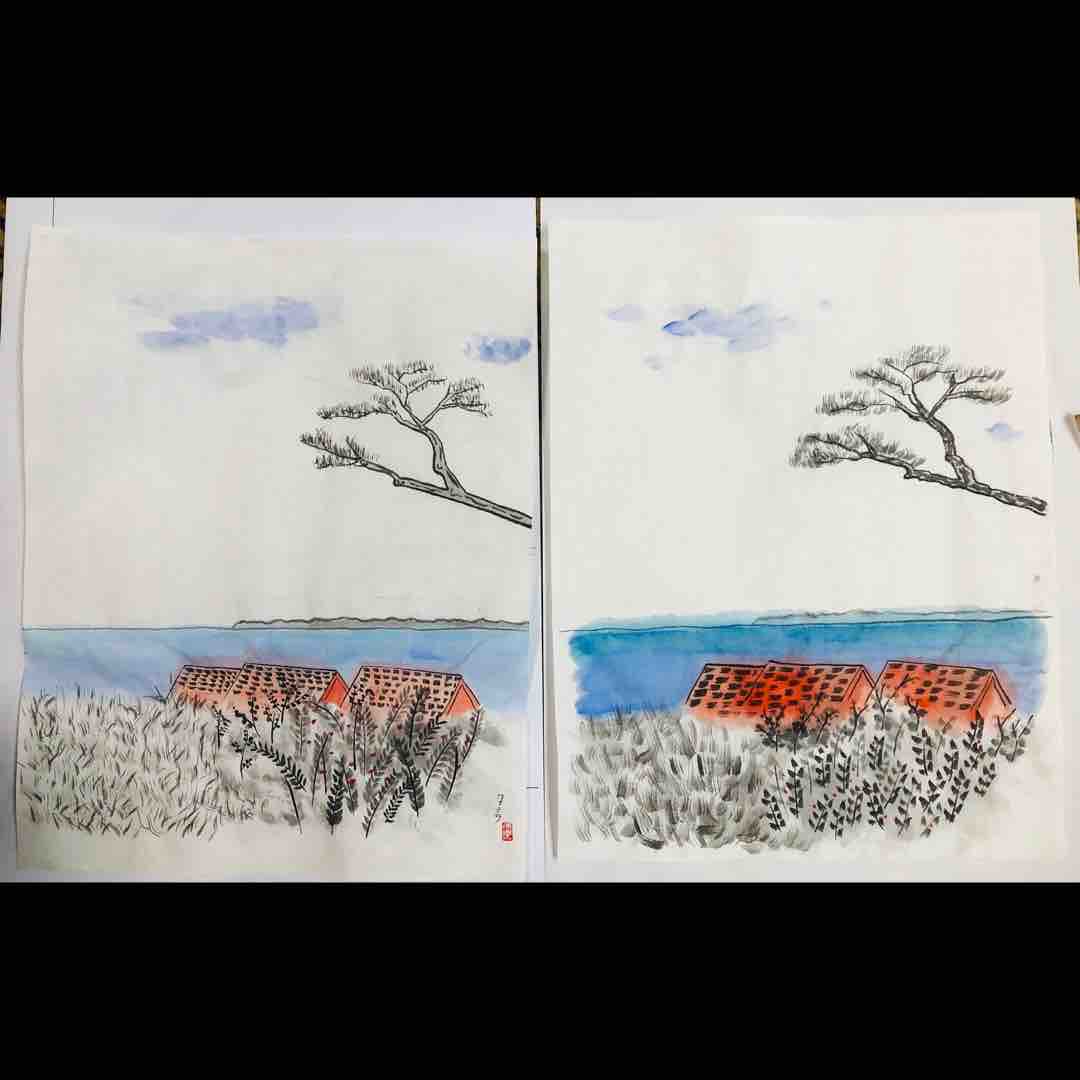 西日暮里第二日曜クラス生徒さん作品。風景の自由課題で、自分で好きな風景を墨を使って表現してもらいました。清水寺を描かれた生徒さんは、まだ水墨画を始めて間もない生徒さんですが、素晴らしい作品をわずか2時間で仕上げられました😊始めたばかりで自由課題が難しい生徒さんには、教科書に載っている風景を描いてもらいました。この日はウクライナとフランスの生徒さんも参加され、国際色豊かな賑やかな授業になりました。皆さん自由に筆を動かし、素敵な作品に仕上がりました☺️