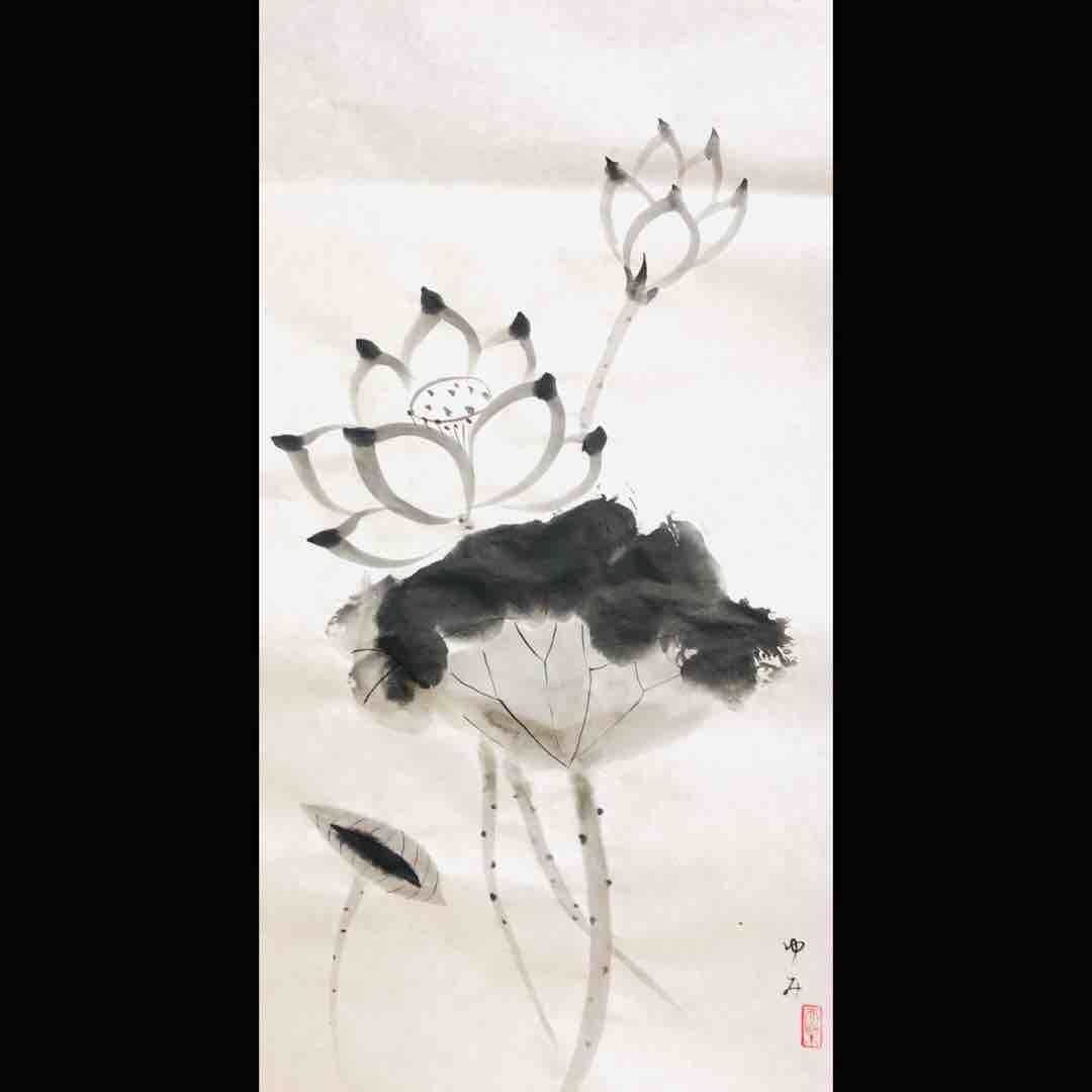橙月水墨画教室応用クラス生徒さん作品。半切2分の橙月水墨画教室応用クラス生徒さん作品。半切2分の1の、いつもより少し大きめの紙に、蓮を描きました。葉は、大きな筆を使って大胆に墨を撒き散らしながら描きます。大きな紙はあまり描いたことがないという方が殆どだっので、皆さん最初は躊躇されていましたが、慣れるととても楽しく自由に描けるようになりました😊