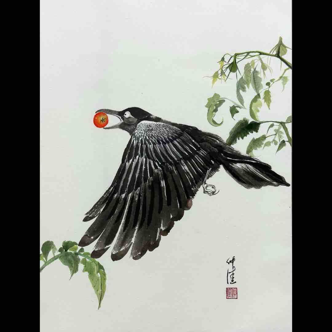 「トマト泥棒」2024 Painted by Nobuka 用賀教室の生徒さん、Mさん作品。Mさんはお教室に通われてまだ半年くらいですが、とてもセンスが良く、エネルギッシュな筆遣いで、いつも自由に楽しい絵を描かれています。今後のご活躍も楽しみです😊