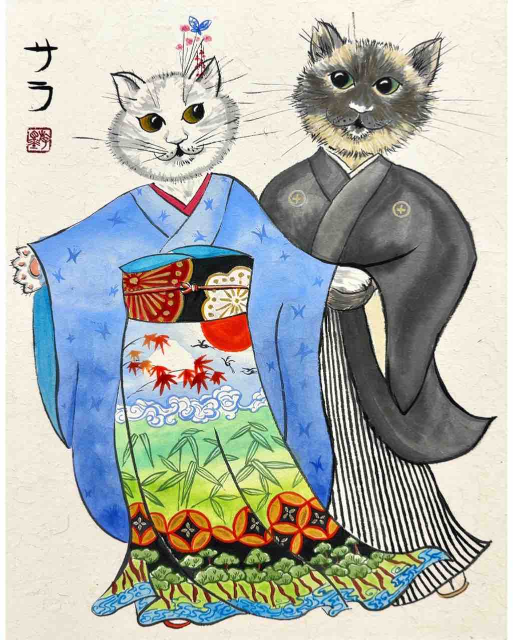「A Match Made in Heaven」 用賀応用クラスで学ばれているイギリス人サラさんの、国際墨画会展出品作品。可愛らしい猫の新郎新婦です😊