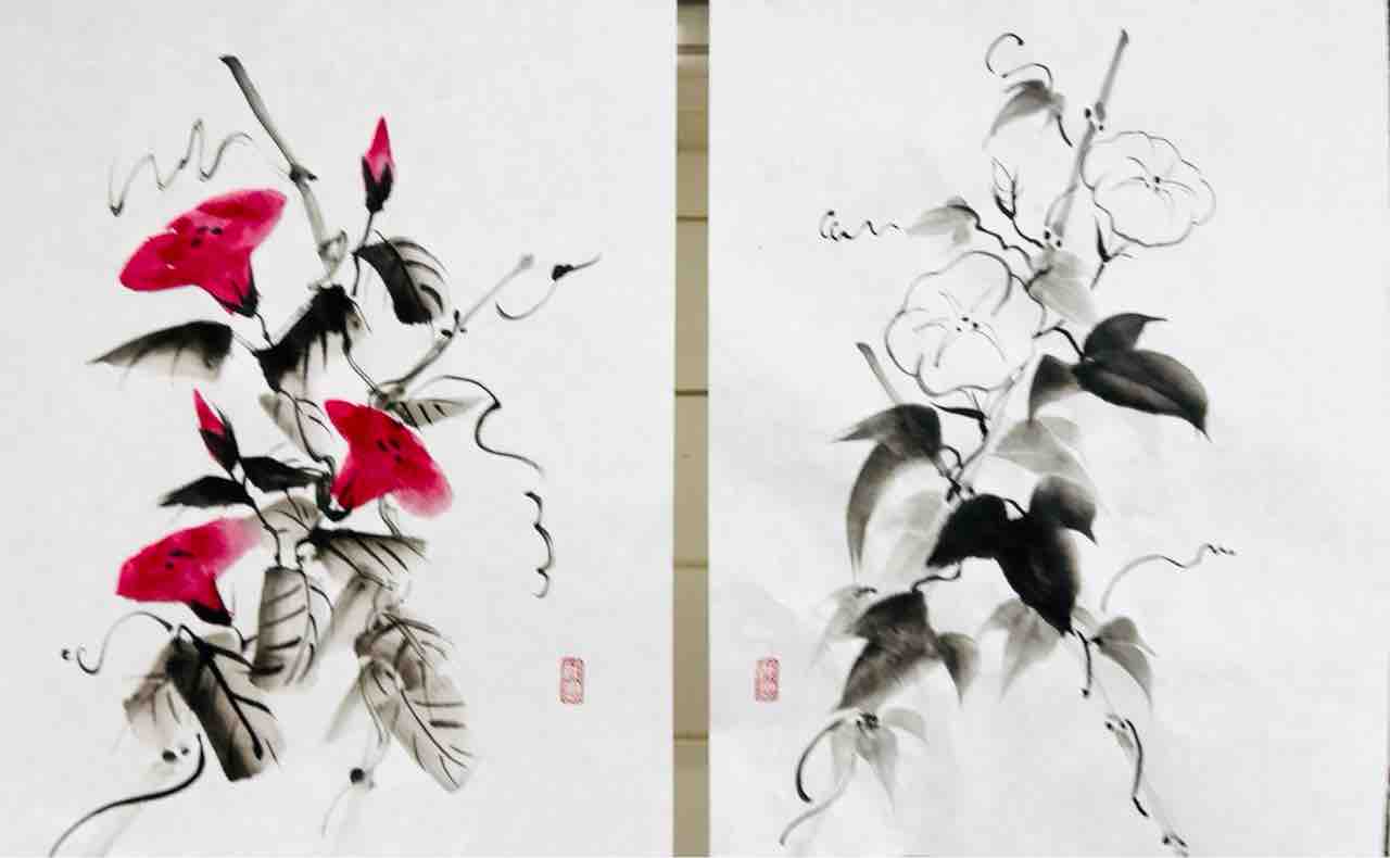 Student works from the Yoga class, held on Fridays and Sundays. This lesson focused on morning glories — a motif where the free-flowing movement of the vines and the use of negative space bring the composition to life.