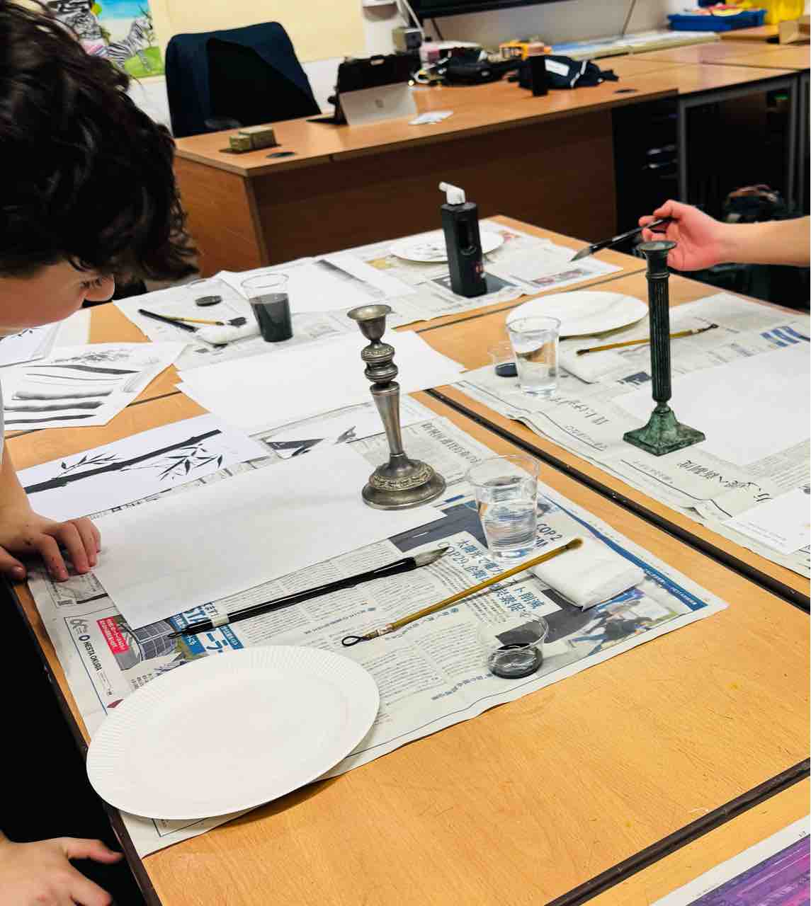 イギリスの学校(Royal Grammar School Guildford)で水墨画ワークショップをやりました。日本語クラスとアートクラスを専攻している生徒さんたちで、皆さん初めての水墨画に興味津々でした。素晴らしい集中力で、それぞれの竹を作品に仕上げました☺️持参してもらった文鎮代わりのペーパーウェイトが秀逸です😆