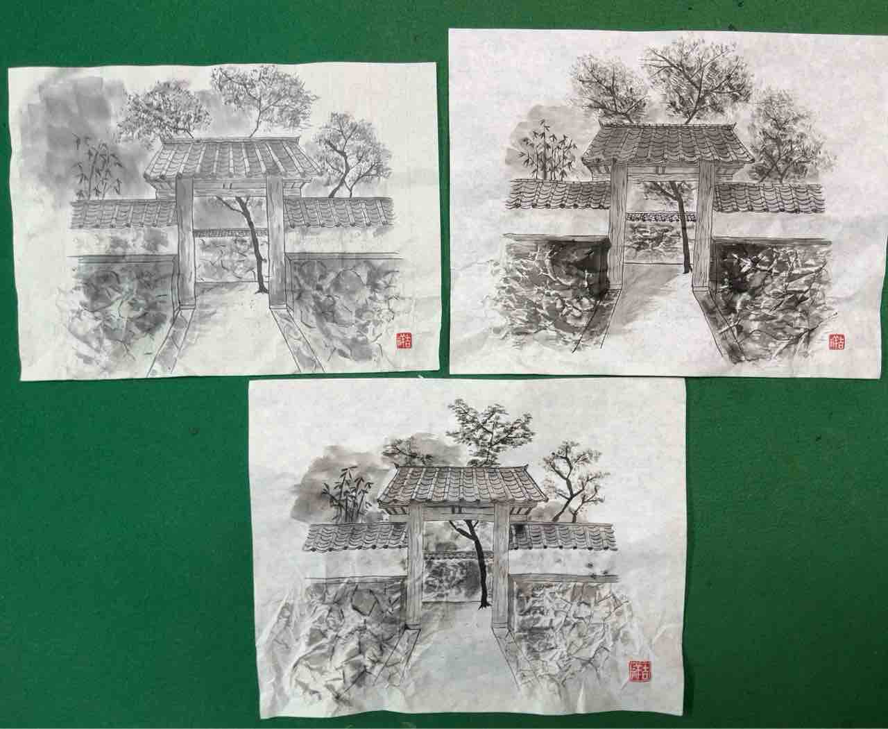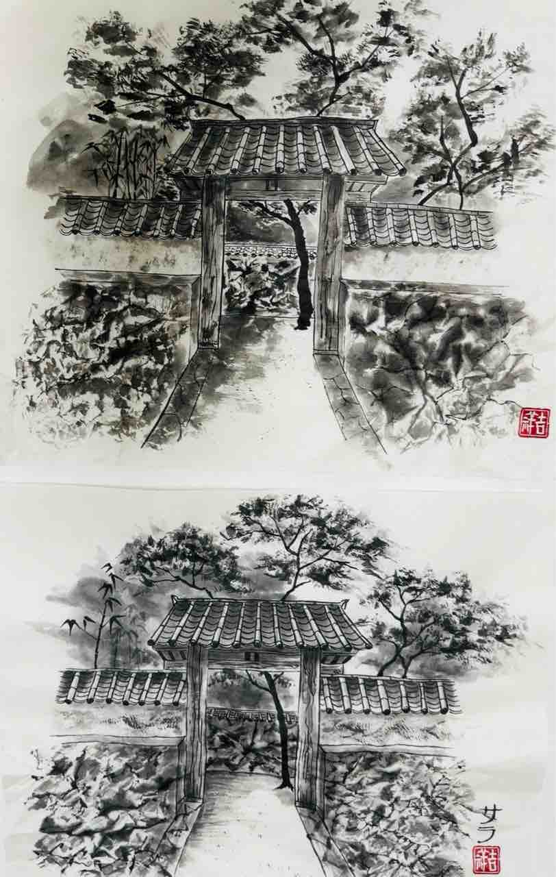Using two techniques with textured (momi-gami) paper, they painted the stone wall and white plaster wall, then drew the gate in linework and layered the shadows. Trees and bamboo were added to harmonise naturally with the scene.