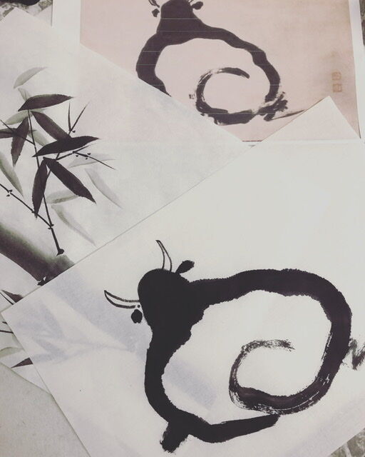 2021年01月16日 ズーム水墨画レッスン Zoom Sumi-e lesson オランダの方と、初ズームレッスン。丑年なので、弘巌玄猊の禅の牛と、竹を描きました。 Zoom lesson with a student from Netherlands.