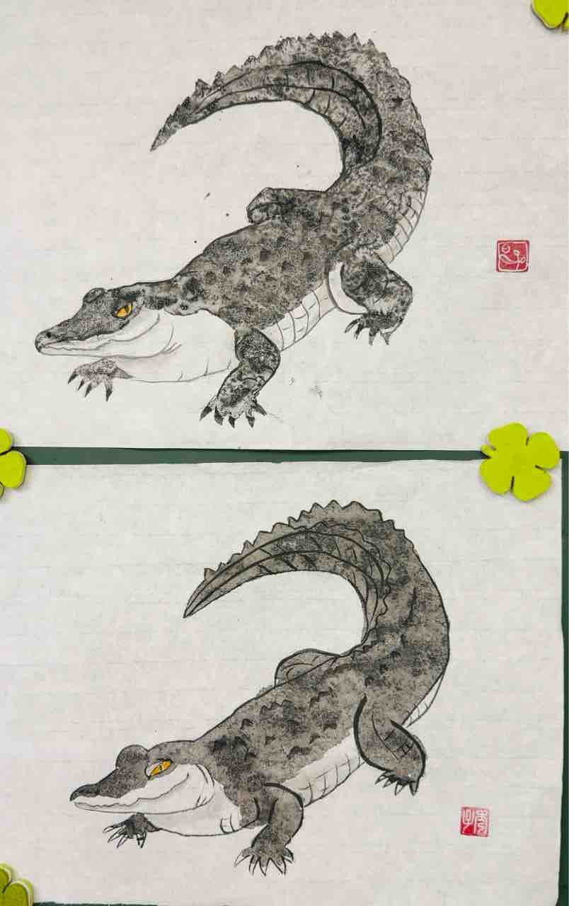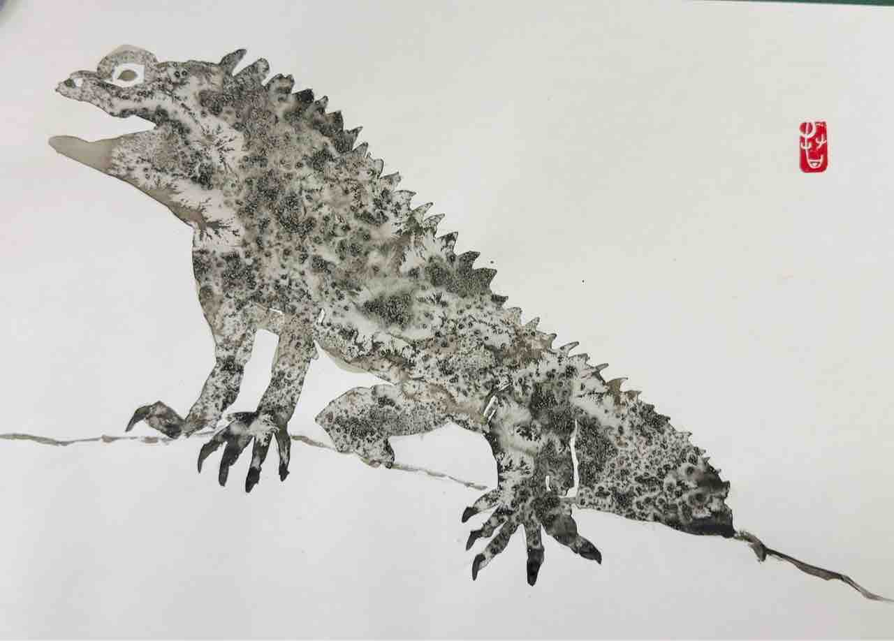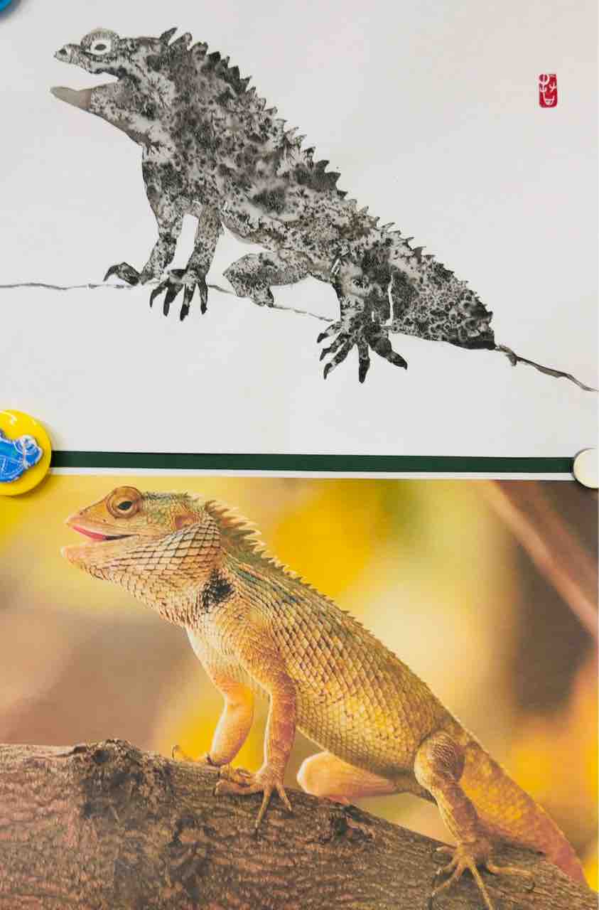 Sakura-Josui Class. Students painted reptiles using the salt technique. While looking at photos, they created freely, resulting in lively and delightful works.